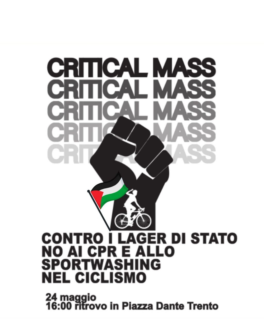 🚲Verso la fine del mese il giro passerà anche da Trento, alcuni giorni prima, sabato 24 maggio alle 16:00, troviamoci per attraversare insieme le strade della nostra città con la bici o qualsiasi mezzo. Critical mass è simbolo di movimento e libertà di movimento, rivendica un’idea di sport e di mobilità, incompatibile con qualsiasi forma di discriminazione e violenza istituzionale.